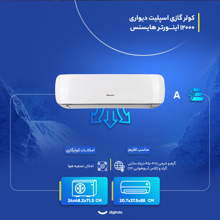 کولر گازی مدل «HIH-12TG» از کولرهای اسپلیت ساخت شرکت «هایسنس» است که با برخورداری از دو عملکرد سرمایش و گرمایش و ظرفیت 12000 میتواند در فصول مختلف مورد استفاده قرار گیرد. کمپرسور دستگاه دارای اینورتر بوده که کمک شایانی به بهبود عملکرد اسپلیت کرده است. کمپرسورهای کولر گازی از نظر نوع عملکرد میتوانند دور ثابت یا دور متغیر(اینورتر) باشند و عملکرد اینورتر منجر به صرفهجویی در مصرف انرژی خواهد شد. دستگاهHIH-12TG مانند تمامی کولرگازیهای اسپلیت دارای دو قسمت داخلی و خارجی است. قسمت خارجی وظیفهی خنککردن گاز را برعهده دارد که بیرون اتاق یا سالن و در فضای باز نصب میشود، بدنهی فلزی دارد و باید روی پایههای مخصوص نصب شود. این یونیت با اتصالات و لولهها به پنل داخلی مرتبط میشود. پنل داخلی طراحی زیبایی دارد، داخل اتاق یا سالن نصب میشود و وظیفهی وزش باد خنک را ایفا میکند. کمپرسور این مدل از نوع روتاری است و با چرخش 360درجهی پروانه، هوا را با قدرت مکش و فشرده میکند و سپس با فشار زیاد از دریچهی خروجی بیرون میدهد. از دیگر مزایای این مدل برخورداری از ریموت کنترل است که تنظیم و کنترل دستگاه را از راه دور بهراحتی ممکن کرده است. همچنین بهرهمندی از حالت خواب و فیلتر قابلشستوشو از دیگر ویژگیهای کاربردی این کولر گازی است.